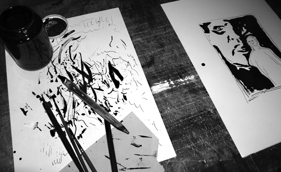 Tuschezeichnungen unter dem Titel „schattengeben“ angefertigt. Bereits