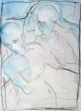60 cm großen Grafitzeichnungen, deren Konturen von einem lasierenden Blau