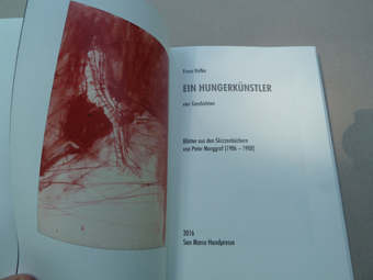 I libri bianchi Band 17 Franz Kafka Ein Hungerkünstler Vier Geschichten Erschienen im Sommer 2016, gesetzt aus der engen Futura. Im Buch sind Blätter aus den Skizzenbüchern von Peter Marggraf (1986 bis 1988) wiedergegeben. Preis: 28,00 Euro zuzügl. versicherter Versand Bei einer Bestellung ab drei Büchern von der San Marco Handpresse werden diese (innerhalb Deutschlands) versandkostenfrei verschickt. "i libri bianchi" Eine kleine Reihe digital gedruckter Bücher mit Reproduktionen als Bebilderung. Die Reihe i libri bianchi (die weißen Bücher) soll als Edition in einer Auflage von jeweils 100 Exemplaren fortgesetzt werden: digital gedruckt, von Hand gebunden (fadengeheftet) und mit Schutzumschlag, numeriert und signiert. 64 bis 68 Seiten im Format 15 x 23,5 cm. Gedruckt sind die Bücher auf 145 gr/qm Bütten.