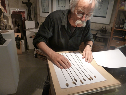 Peter Marggraf in der Bildhauerwerkstatt. Arbeit am Herbar |