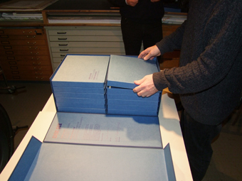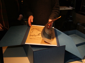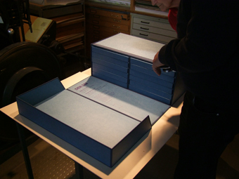 oben liegenden Mappe mit den Monotypien auf zwei Reihen mit jeweils sechs