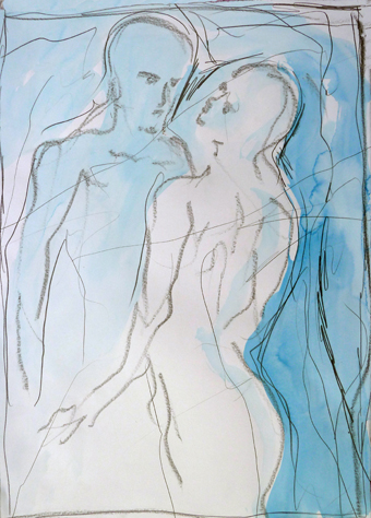 60 cm großen Grafitzeichnungen, deren Konturen von einem lasierenden Blau