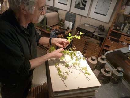 Peter Marggraf in der Bildhauerwerkstatt. Arbeit am Herbar |